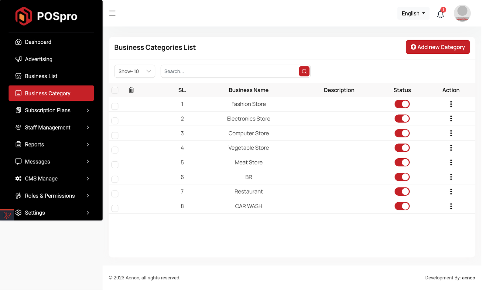 This appears to be a screenshot of a business categories list. Here, you can filter business categories, as well as edit, delete, or multi-delete them. There is also an "Add New" button for adding new business categories. To add a new business category, fill in the necessary fields. You need to enter the business name, and the description field is optional. You can also update the status from this page.