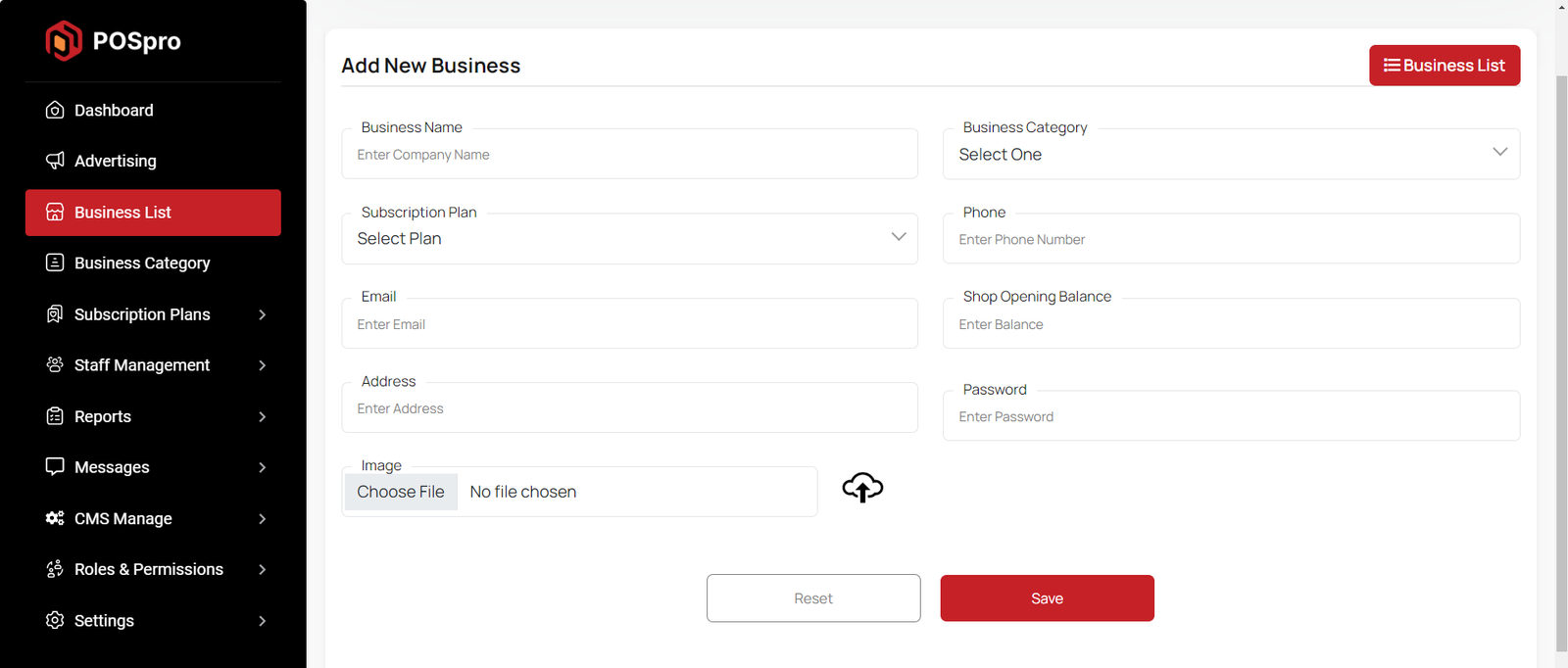By clicking on the "Add New Business" button, you can create a new business. You will need to fill in the necessary fields. Here is the screenshot of the create business page.