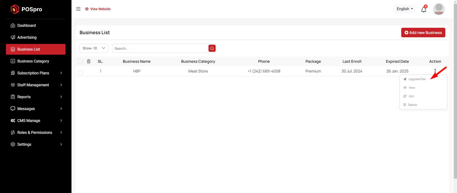This appears to be a screenshot of a business list page. Business list functionalities typically allow users to collect and organize information about businesses. By clicking the "View" button, you can see the details of each business. You can also create a new business by clicking the "Add New Business" button. Below, we'll describe how you can create a new business.