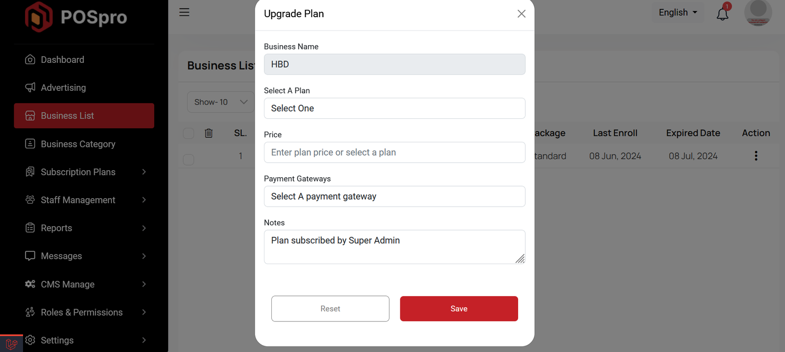 If you need to upgrade the plan for any business, click on the "Upgrade Plan" button. You will likely see a popup for this. Here, you can update the plan, gateway, price, and notes. When you select a plan, the price input field will automatically fill in according to the selected plan, but you can also change the price manually. If desired, you can add a note by filling in the notes input field.